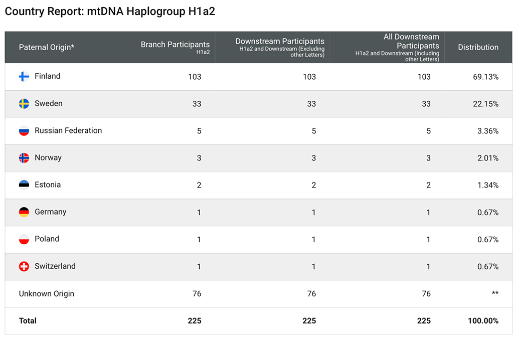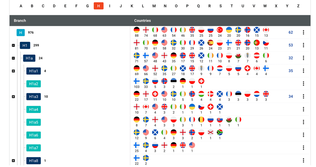 För varje gren visas flaggor, som anger i vilka länder de testade har sin tidigast kända möderneana. Det finns även en sökfunktion för att direkt söka fram en särskild gren.