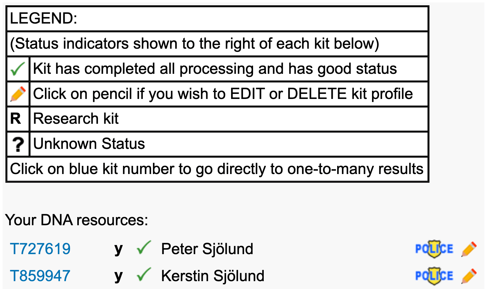 Om ”polisbrickan” är överkryssad, klicka på den och svara ”OK” i den ruta som dyker upp. När polisbrickan inte är överkryssad, då är personen synlig som släktmatchning för polisen.