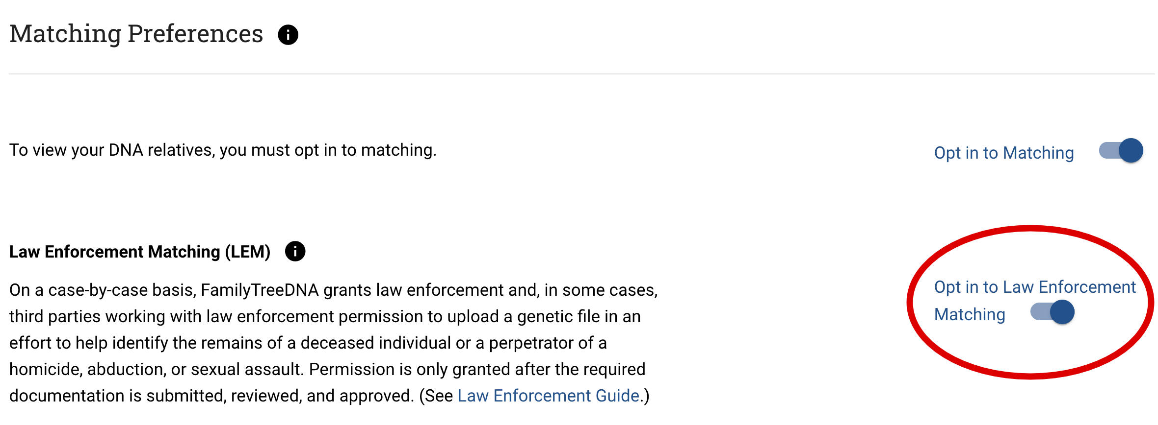 Här ser du till att knappen ”Opt in to Law Enforcement Matching” är skjuten till höger. Klicka på den för att ändra läge. När den är skjuten till höger, så är du synlig som matchning för polisens utredare.