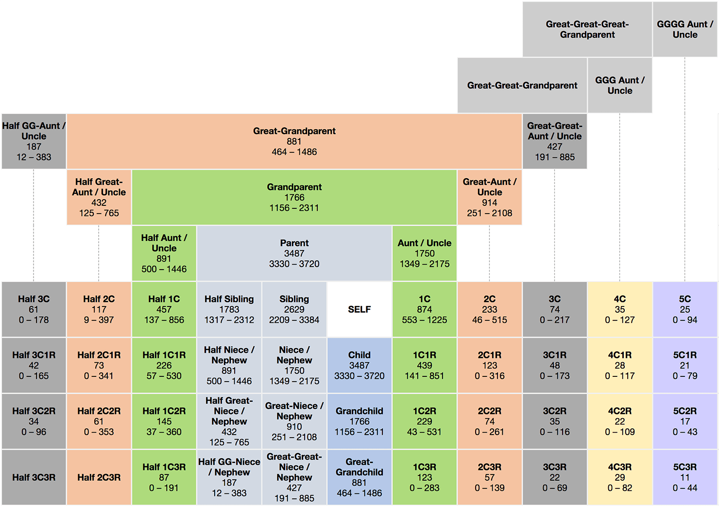 Siffrorna vid varje släktskap är först ett medelvärde för hur mycket man brukar matcha vid ett sådant släktavstånd. Därunder står sedan hur mycket man som minst kan matcha och hur mycket som man max kan matcha.