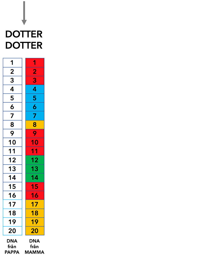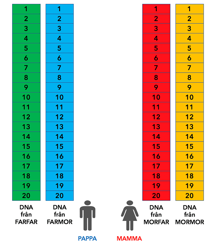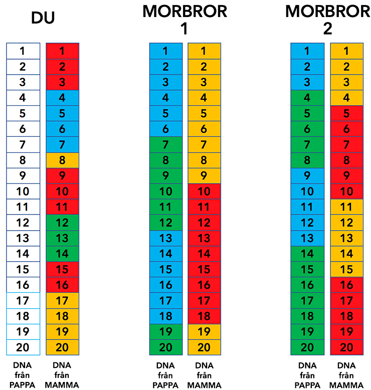 Varje kromosom består egentligen av miljontals delar, men om vi förenklar det hela till att en kromosom har 20 bitar, så kan det se ut så här när din mamma och hennes två bröder har ärvt ett kromosompar från sina föräldrar: