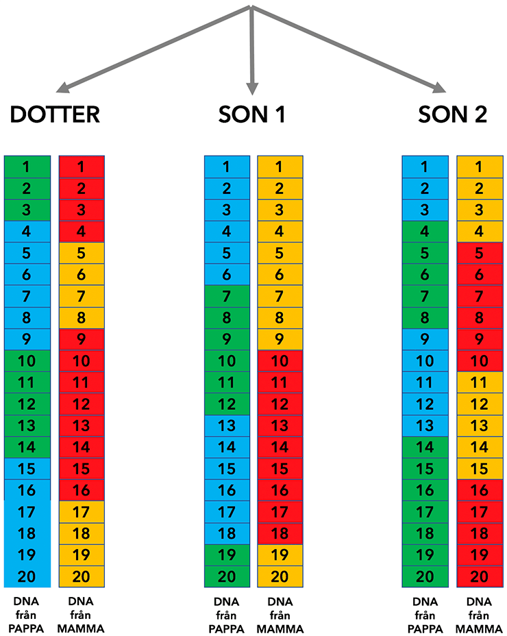 De tre syskonen ärver en hel kromosom från pappa och en hel från mamma. Den kromosom som pappa lämnar över till barnet är en blandning av hans föräldrars DNA och på samma sätt är mammans kromosom en blandning av hennes föräldrars DNA. Blandningen blir olika varje gång, därför får barnen olika blandningar av sina far- och morföräldrars DNA.
