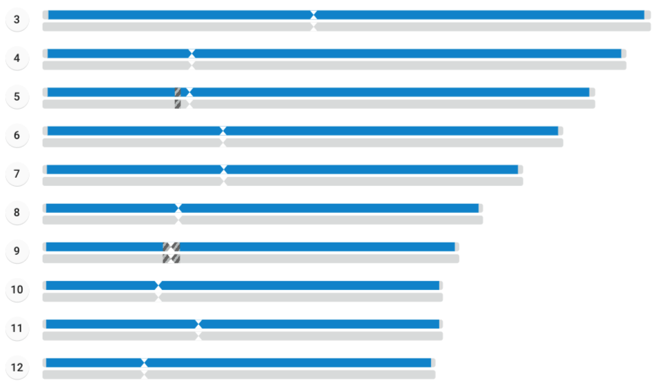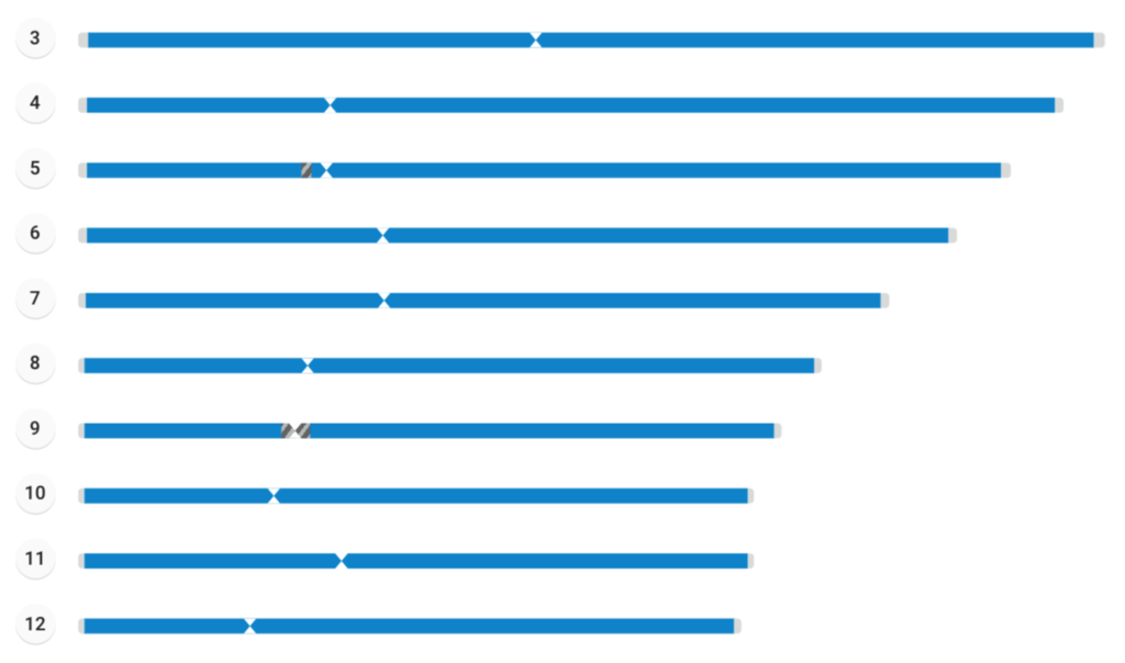 Anledningen till att det ser ut så här är att varje kromosom som visas egentligen är ett par av kromosomer, en från mamma och en från pappa. DNA-analysen kan inte skilja på vilket DNA som ligger på mammas kromosom och vilket som ligger på pappas. Därför visas de två kromosomerna som om de låg ovanpå varandra.