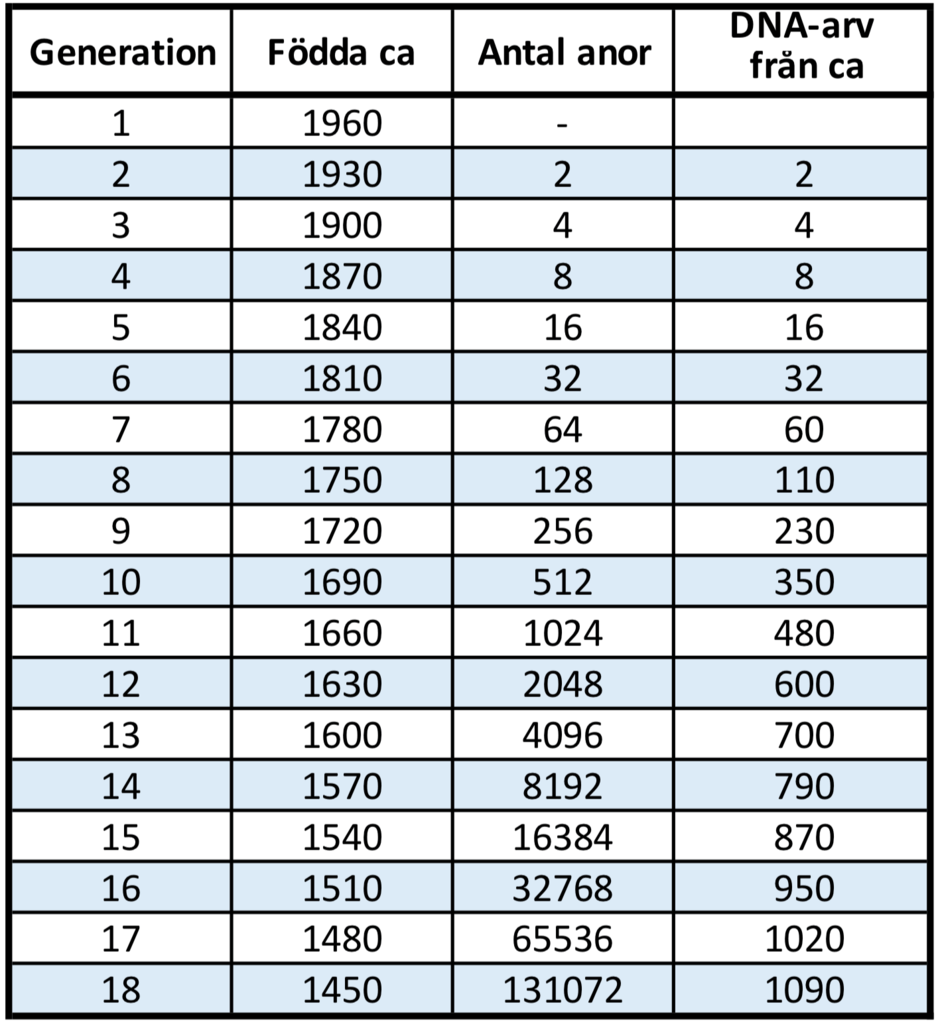 I tabellen nedan ser du hur många anor du har i varje generation av din antavla. I den högra kolumnen står hur många anor som du har ärvt något DNA från (siffrorna är ungefärliga antal från matematiska simuleringar).