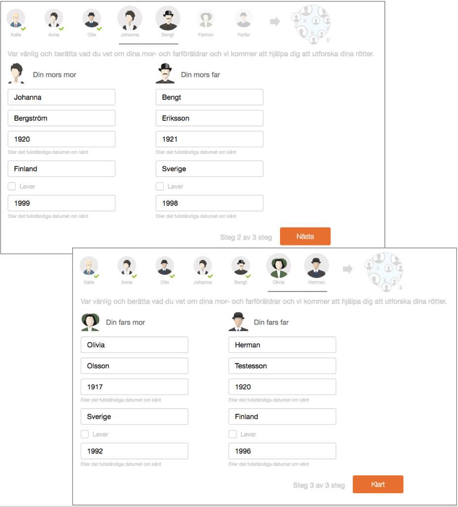 På de följande två sidorna finns möjlighet att skriva in uppgifter för dina mor- och farföräldrar. Gör gärna det, eftersom det underlättar för dina DNA-matchningar att hitta dig och söka efter ert släktskap. (Det går även att hoppa över dessa två sidor)