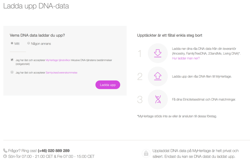 Nu öppnas sidan där du laddar upp datafilen. Kryssa i vems DNA det är och när du har läst villkoren kryssar du i rutan att du accepterar tjänstvillkoren. Denna ruta är obligatoriskt att kryssa i för att komma vidare. Den andra kryssrutan är frivillig och den kryssar du i om du accepterar att ditt DNA-data kan användas i olika forskningsprojekt.