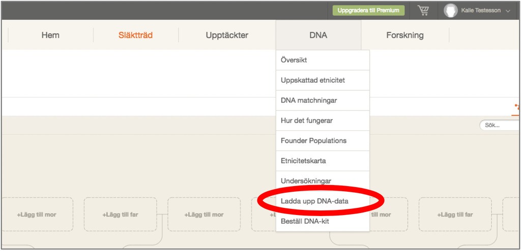 När du valt ditt lösenord är det dags att gå till DNA-menyn (se nedan) för att ladda upp din datafil. Klicka på menyn och välj Ladda upp DNA-data.