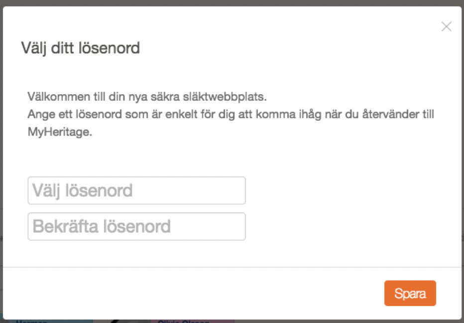 När systemet sökt klart får du välja ett lösenord. Samtidigt ser du ditt lilla släktträd, som du kan bygga vidare på senare om du vill (eller ladda upp en så kallad GEDCOM-fil)