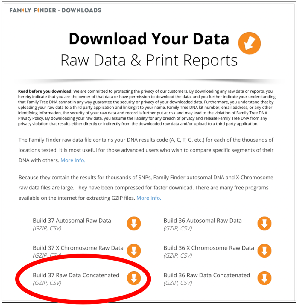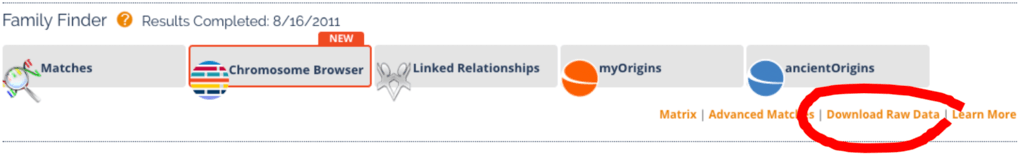 Logga in på ditt konto hos Family Tree DNA. Under knapparna med dina resultat för Family Finder finns en länk för att ladda ner rådata. Klicka på den.