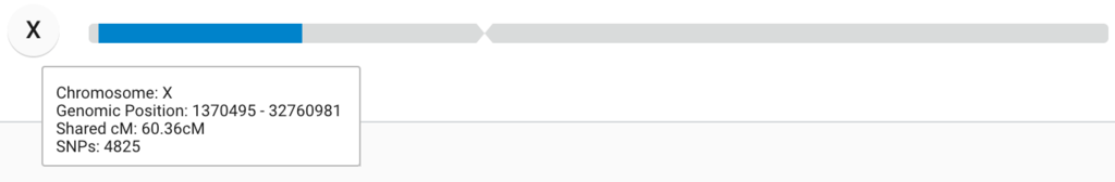 Här har vi ett rejält stort segment på X-kromosomen, 60cM! Det här segmentet är absolut intressant att följa för att försöka hitta den gemensamma anan. Och, jag vet inte om jag nämnt det förut, men detta segment kan alltså inte ha kommit genom två män i rad 🙂
