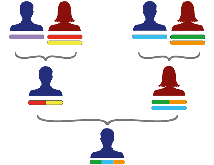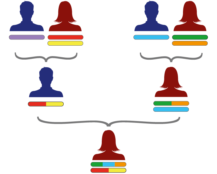Sonens enda X-kromosom består alltså av blandat X-DNA från hans morfar (blått) och mormor (grönt och organge). Han har inget X-DNA från sin pappas sida.