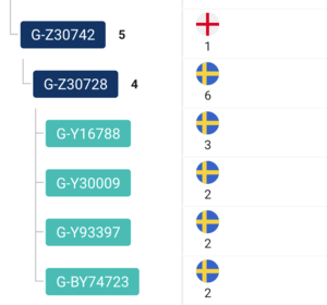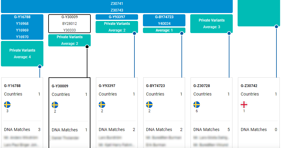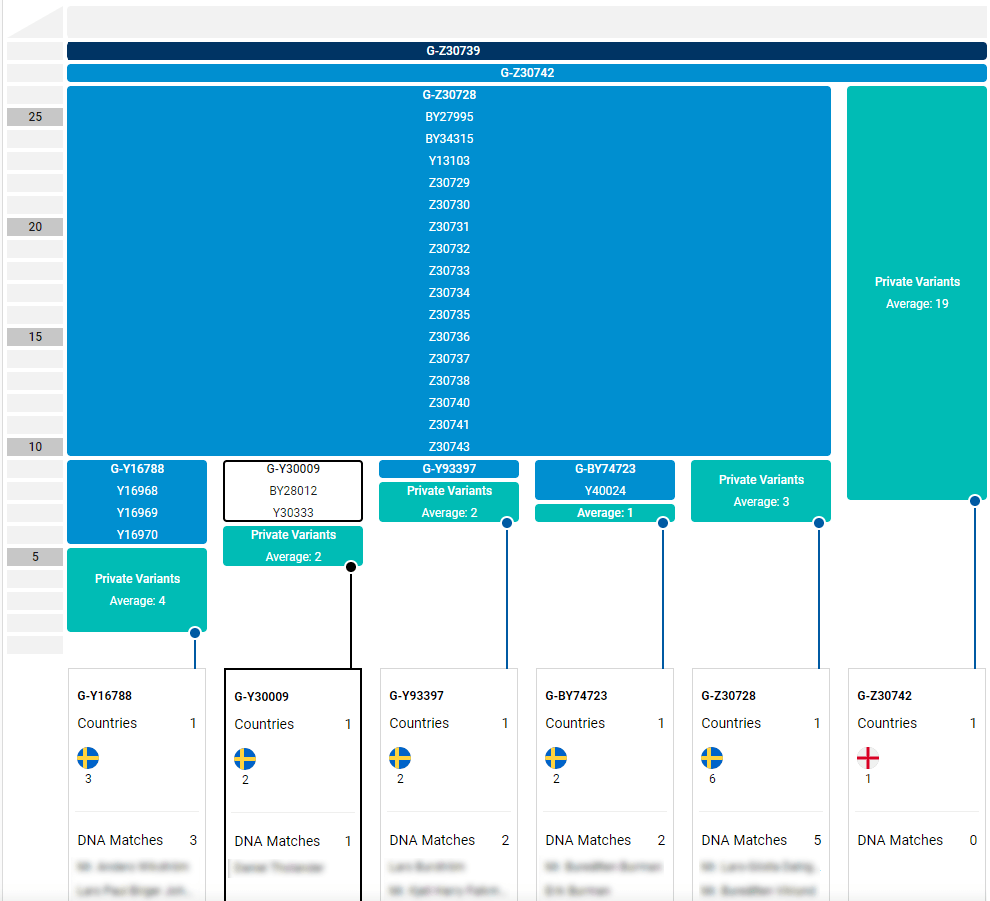 Här visas inte bara grenarna i trädet utan även alla mutationer (i blått) som delas av de testade på varje gren. Även antalet mutationer som är ”privata”, alltså som den testade ännu är ensam om, visas (i grönt). Dessutom får man se namnen och ursprungsland på de testade som man matchar. Det är väldigt mycket användbar information i en och samma bild.