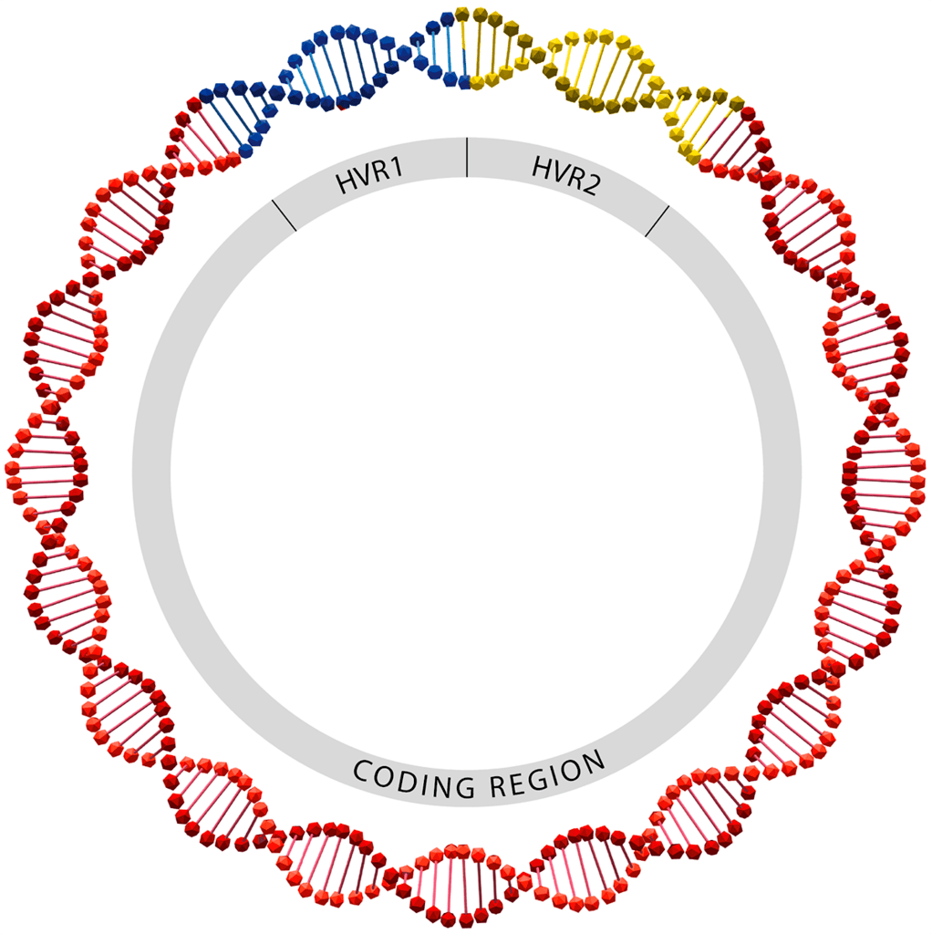 Ringen av mitokondrie-DNA brukar delas in i tre ”regioner”, vilka kallas HVR1, HVR2 och Coding Region.
